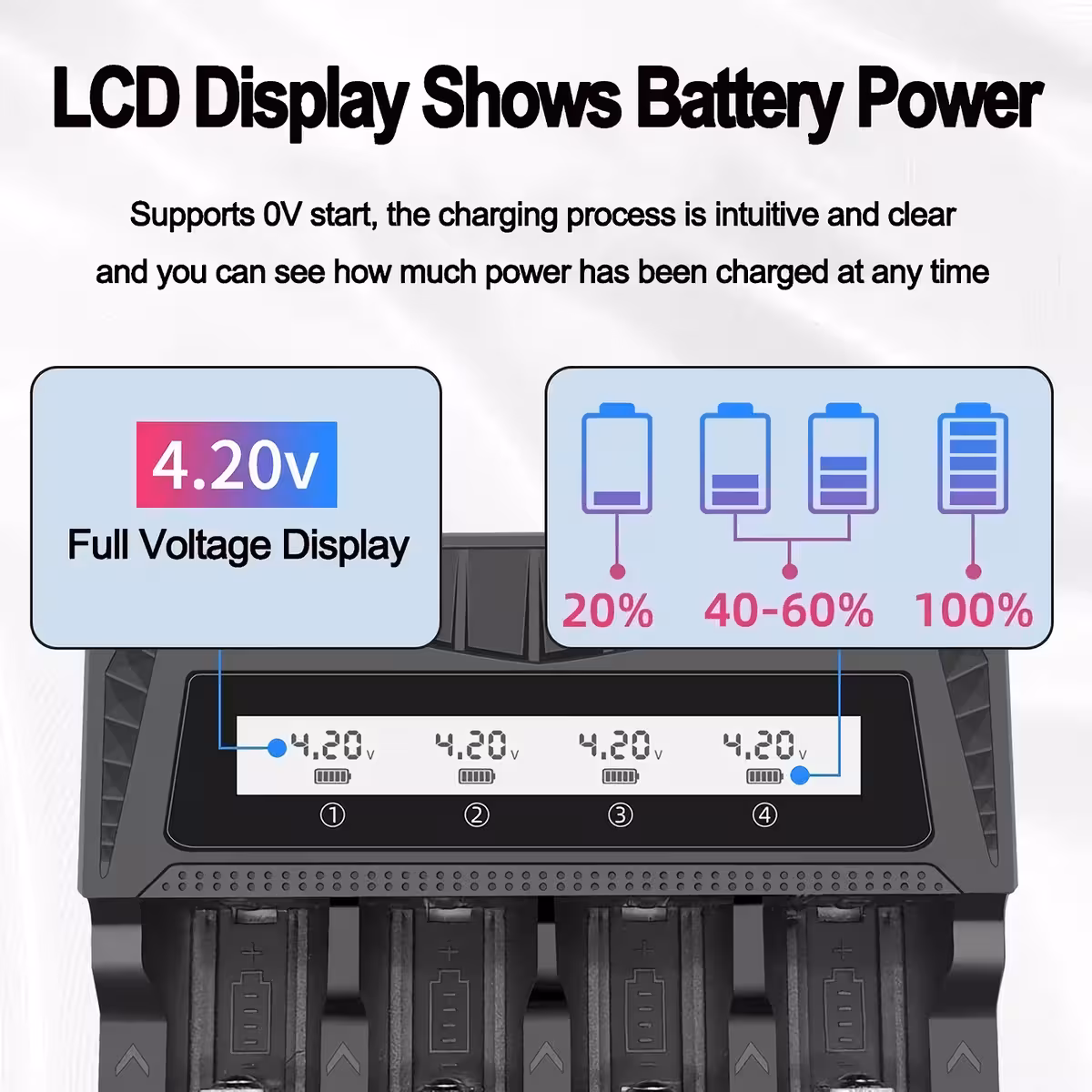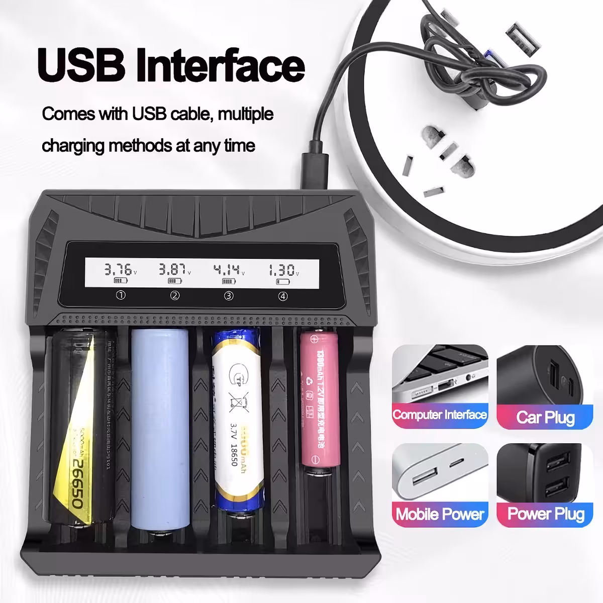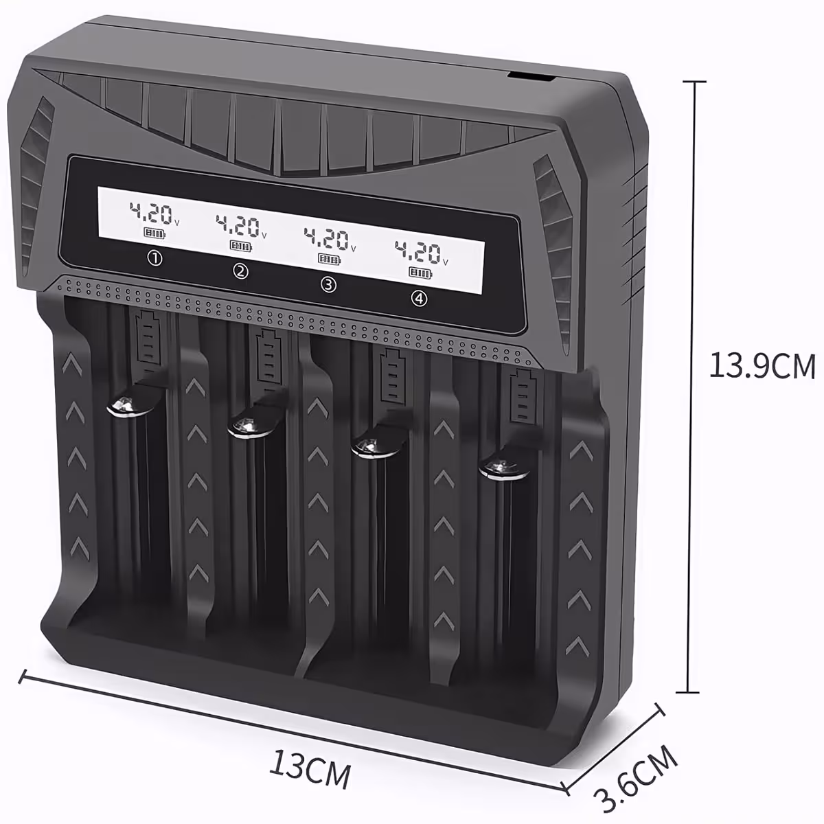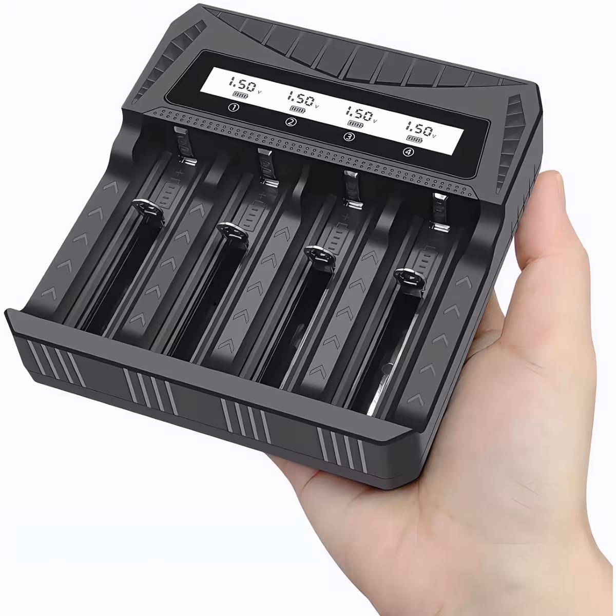formats AA, AAA, 18650, 26650, 21700, 16340, 14500, and many more. Each slot operates independently, allowing