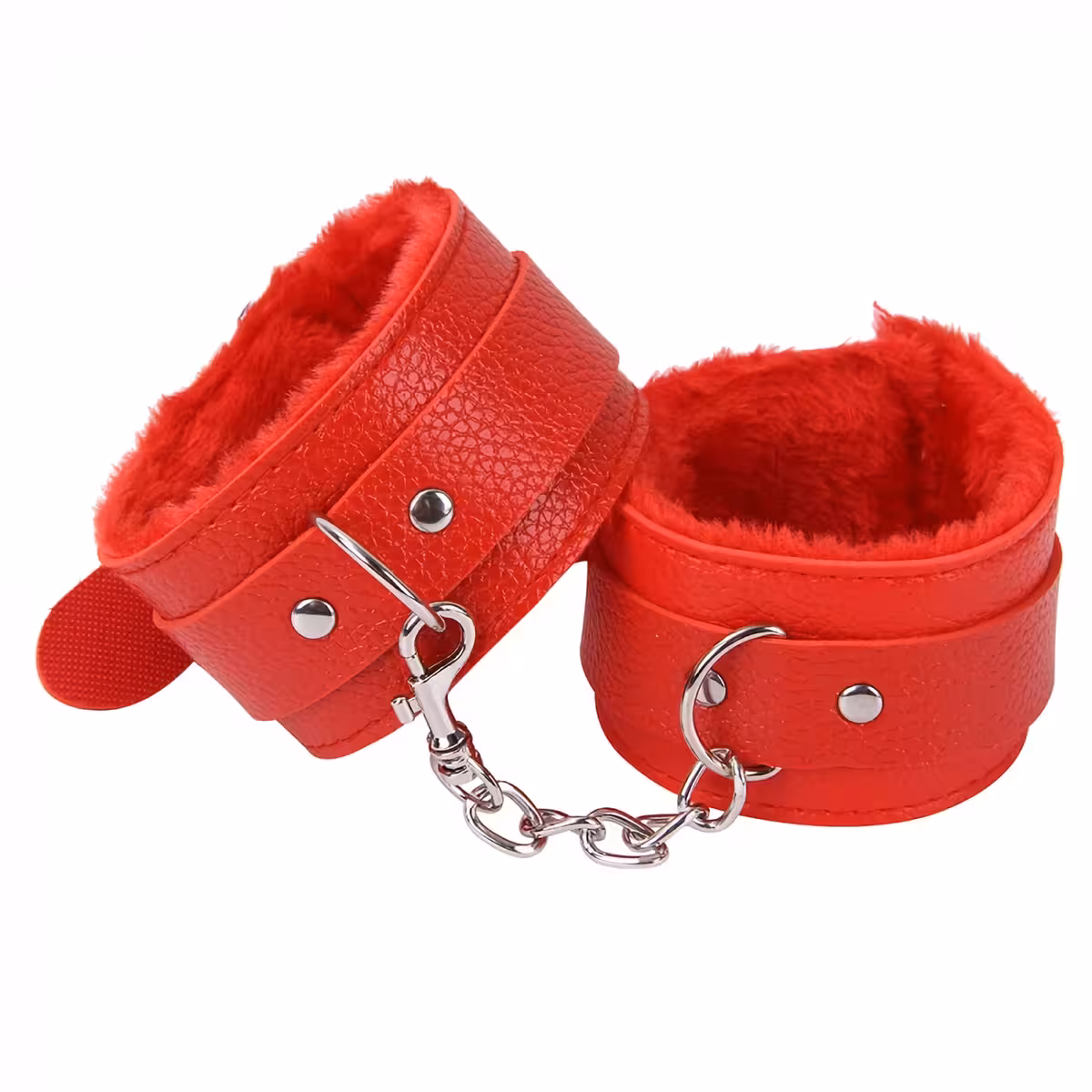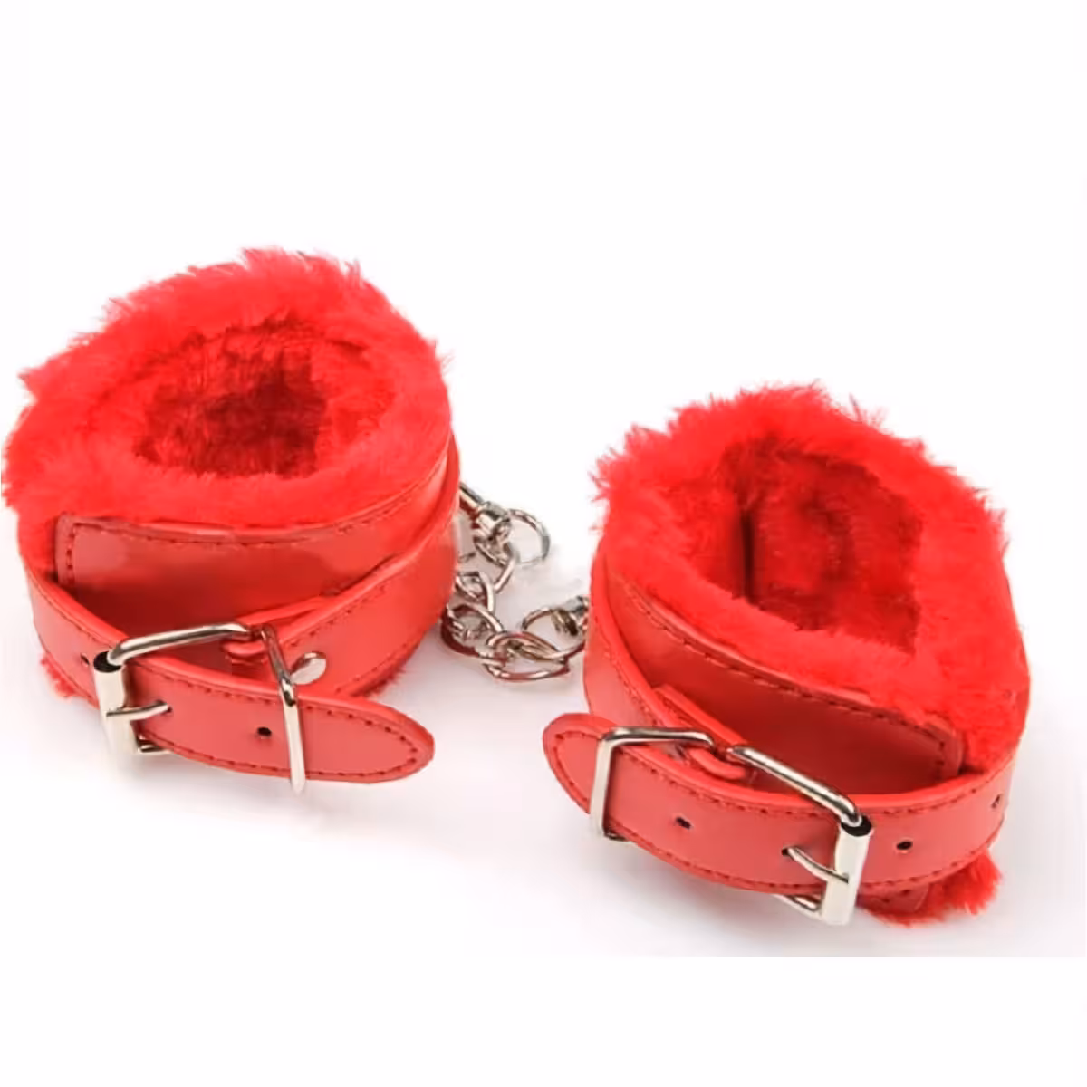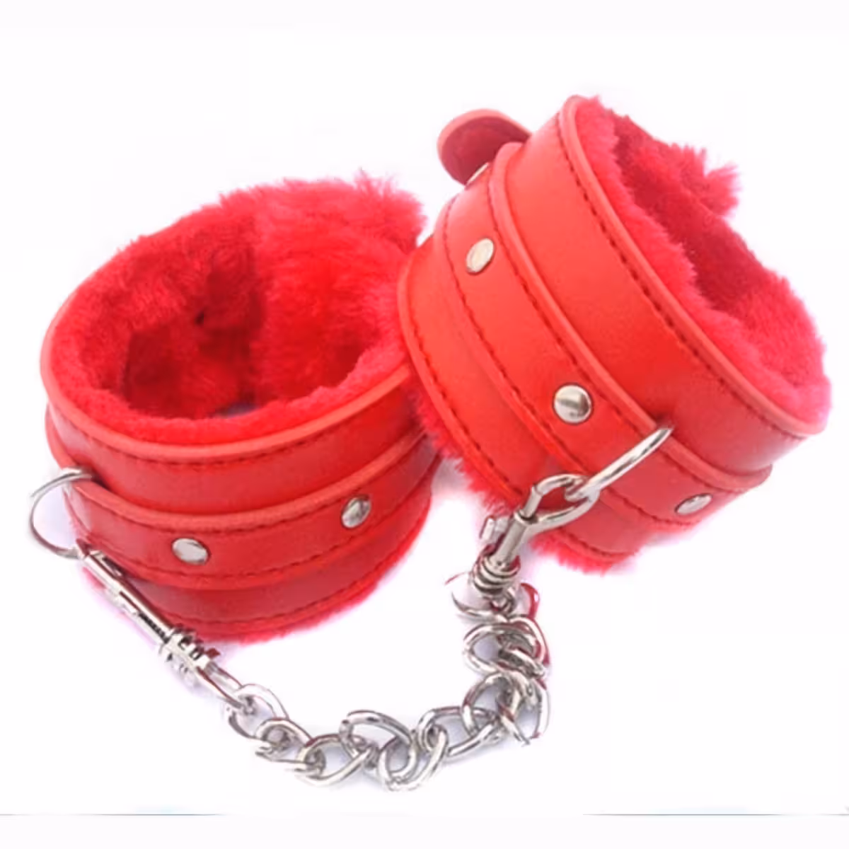 BDSM Handcuffs with Chain, Soft Red or Black Fur – Professional Leather Cuffs for Erotic Play