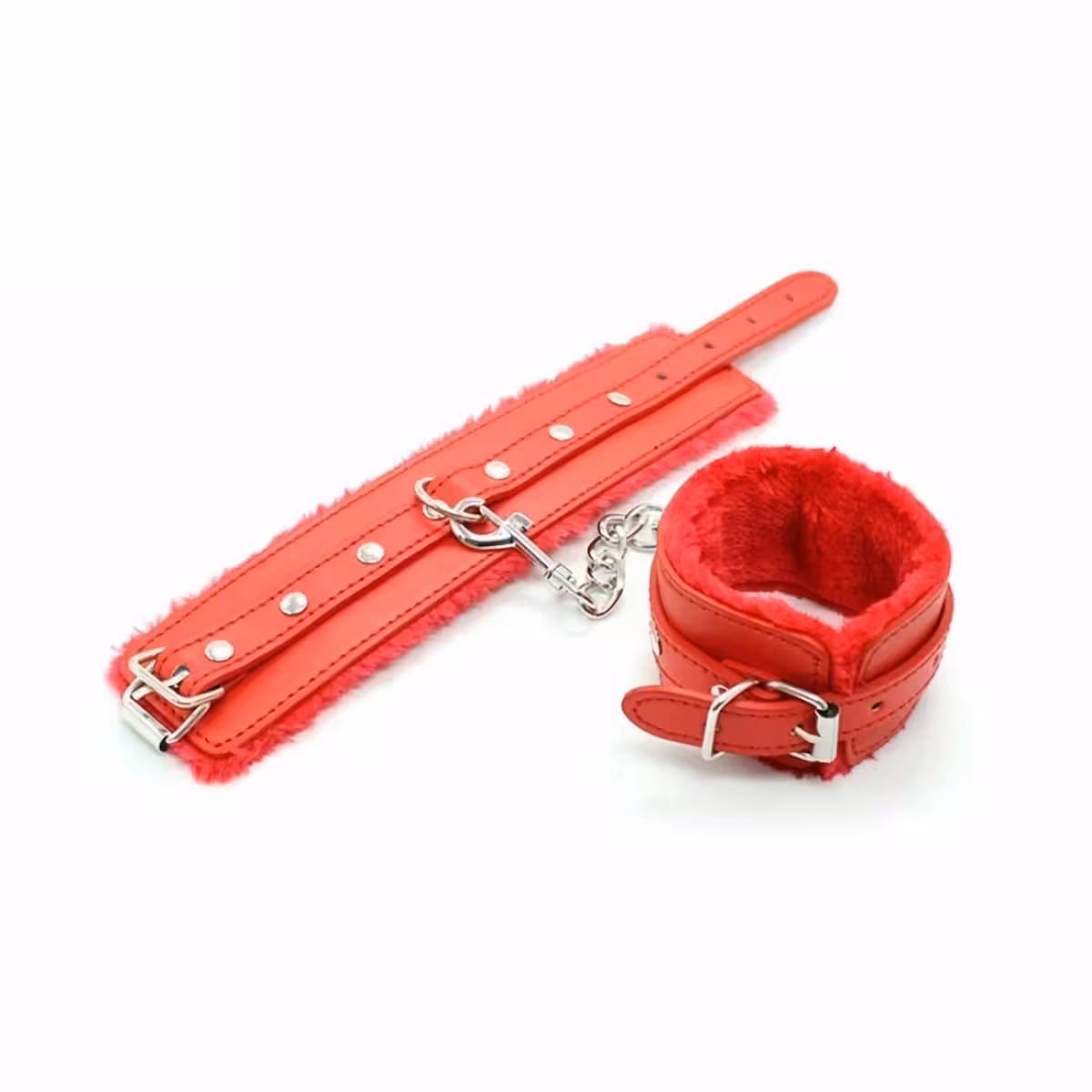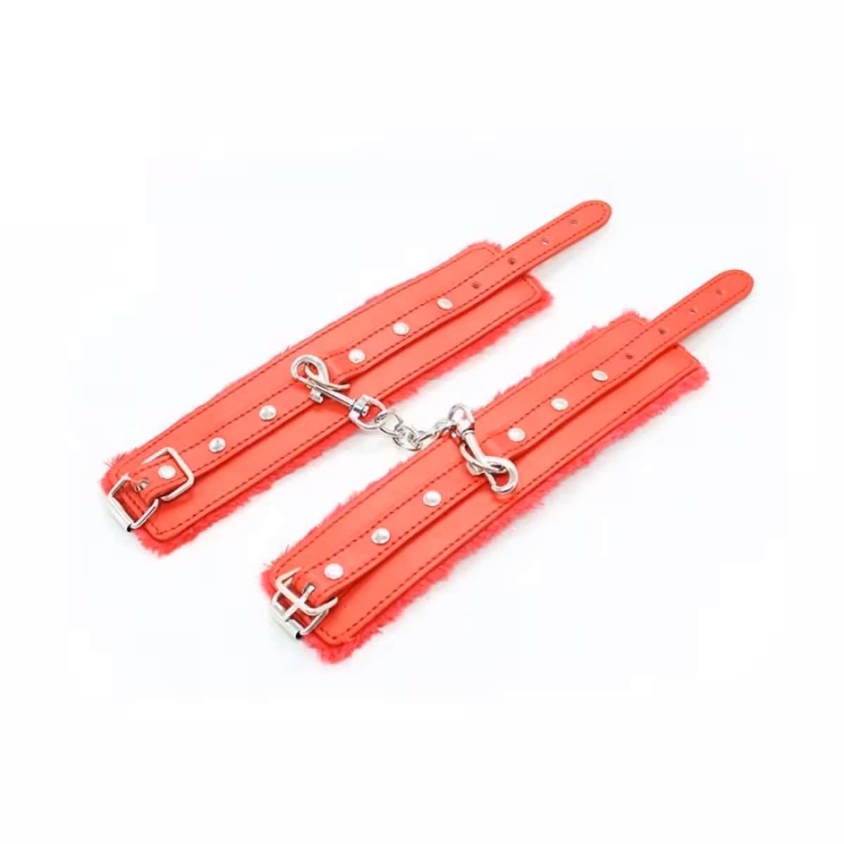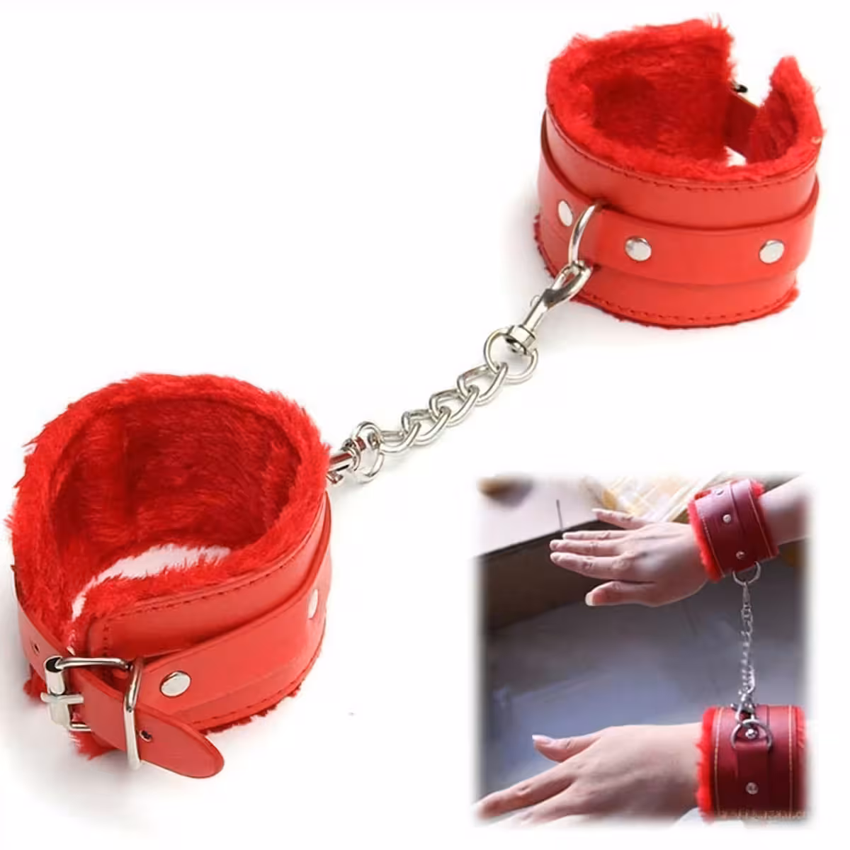 BDSM Handcuffs with Chain, Soft Red or Black Fur – Professional Leather Cuffs for Erotic Play