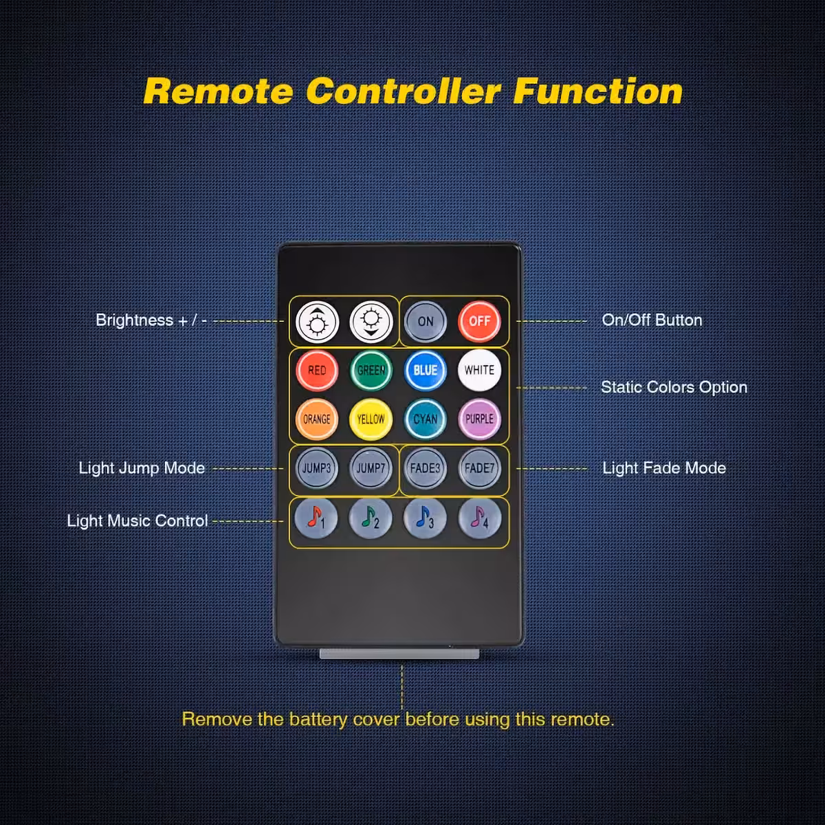 • Remote control with 8 SMD RGB colors and brightness adjustment options.