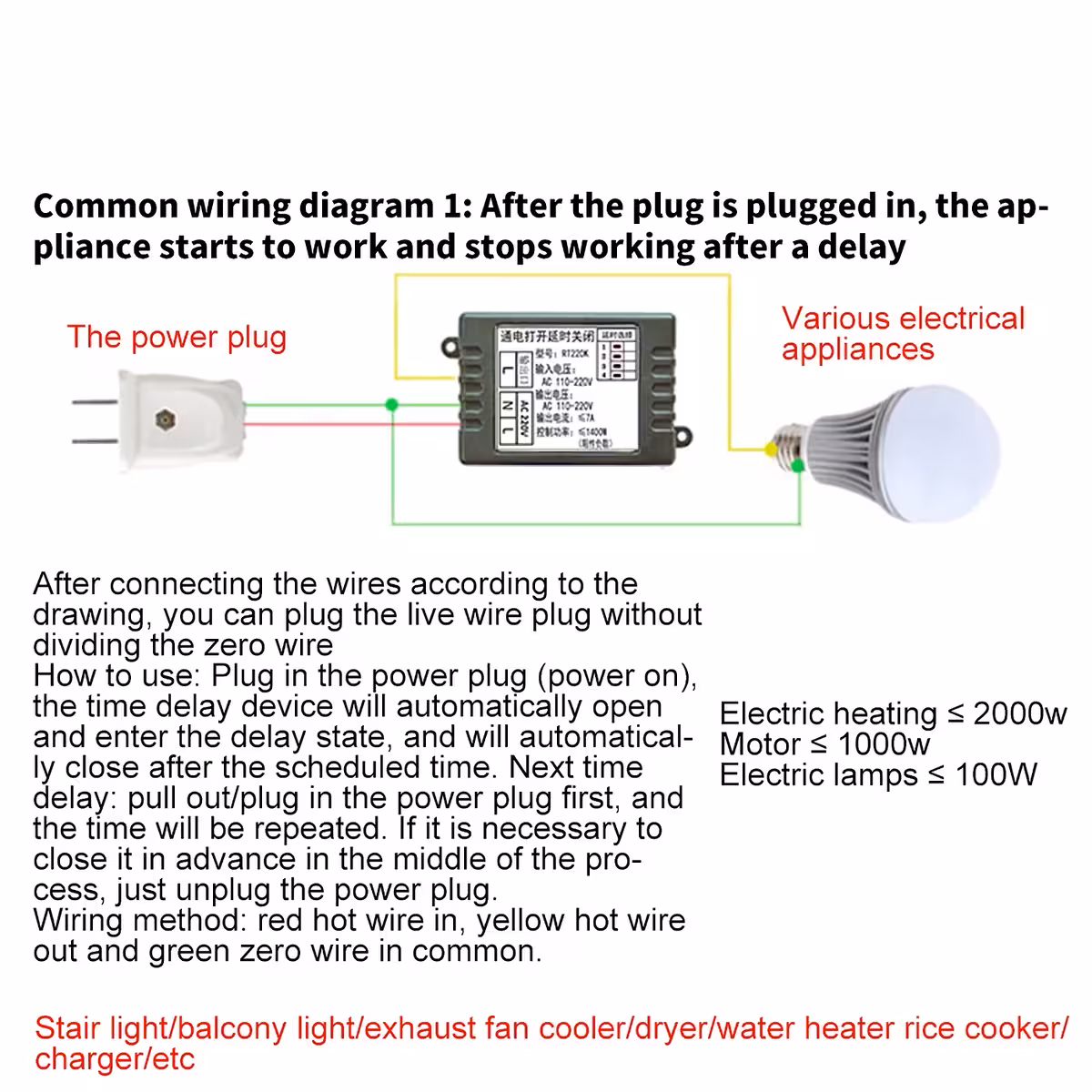 • Function: OFF-delay / return timing => relay turns on immediately when powered, and turns off after the set time expires.