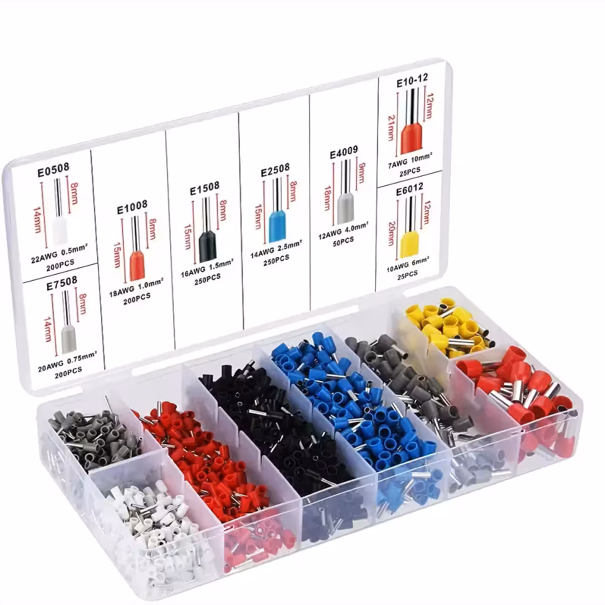 The set also includes 1200 insulated terminal pins (end tubular terminals) for multi-strand electrical conductors, suitable for various wire sizes: