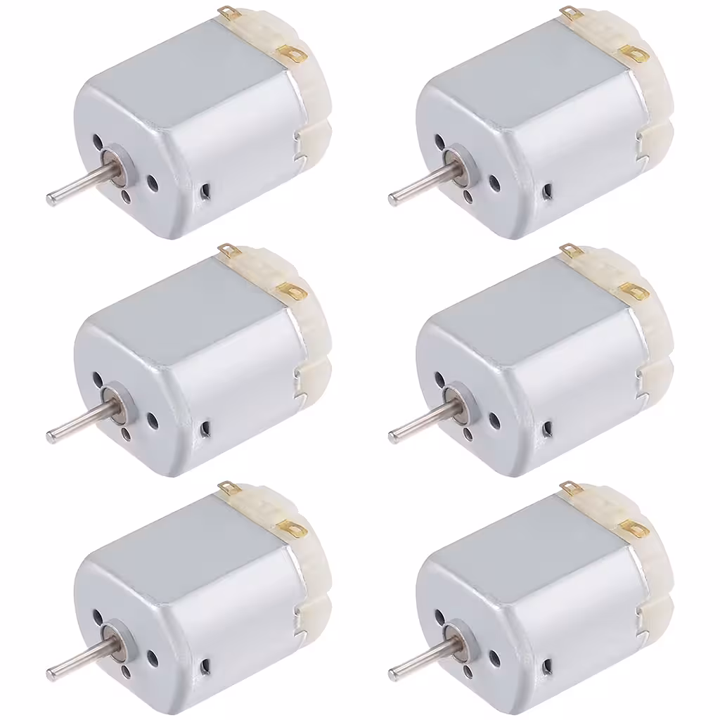 The set includes 6 Mini DC 130 motors, ideal for educational projects, robots, fans, and simple mechanisms. They operate at 3–6 V DC, offering high RPM and compact dimensions. The shaft Ø2 mm × 8 mm is compatible with standard wheels and pinions for micro-motors.