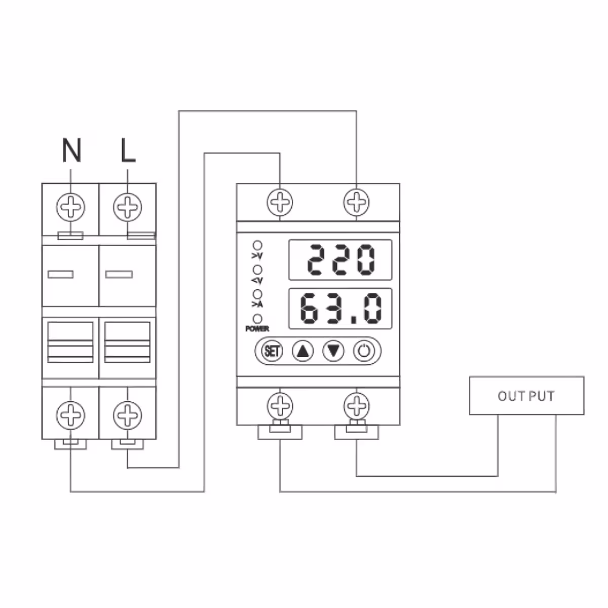 - Robust connection: 4 large terminals for thick cables – phase and neutral at input (top) and output (bottom).